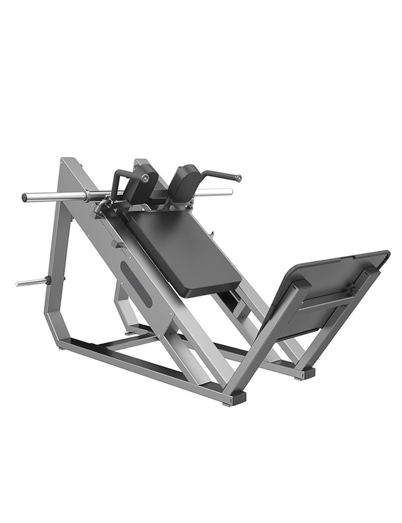 El Hack Squat simula la trayectoria de movimiento de una sentadilla en el suelo, brindando la misma experiencia que el entrenamiento con pesas libres. No solo eso, sino que el diseño de ángulo especial también elimina la carga sobre los hombros y la presión sobre la columna vertebral de las sentadillas en el suelo tradicionales, estabiliza el centro de gravedad del usuario en el plano inclinado y asegura la transmisión directa de la fuerza.